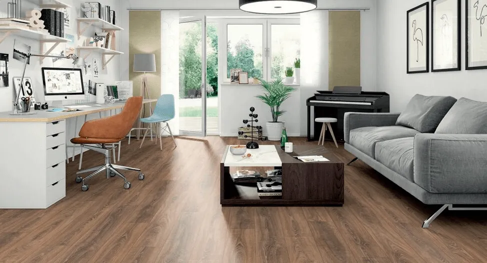 Ламинат изготовлен из влагостойкой панели ХДФ. Её высокие показатели плотности делают покрытие прочным и надежным в эксплуатации. Поверхность полов не царапается животными и не продавливается от бытовых механических воздействий. Она не притягивает пыль, не скользит и легко моется.