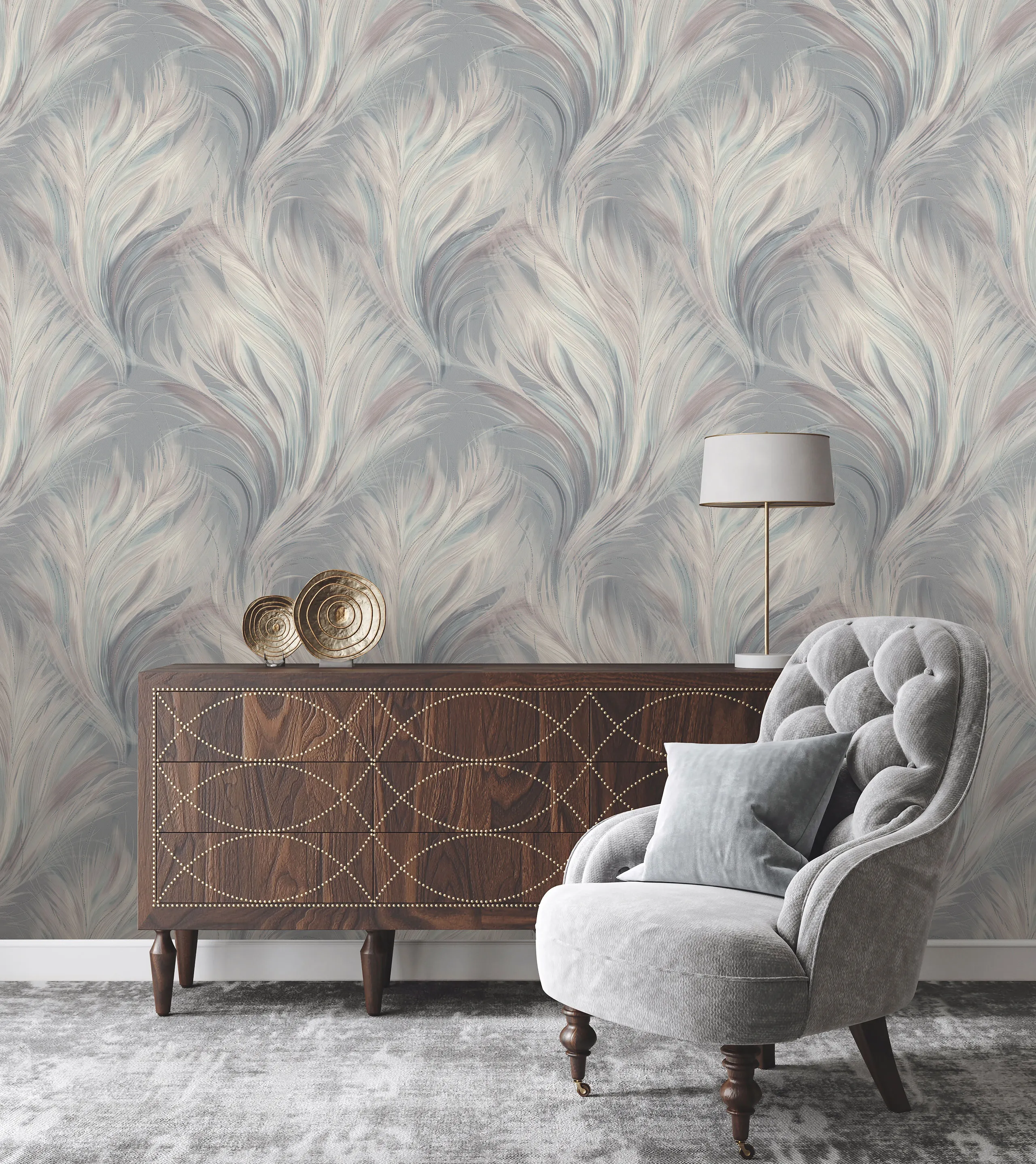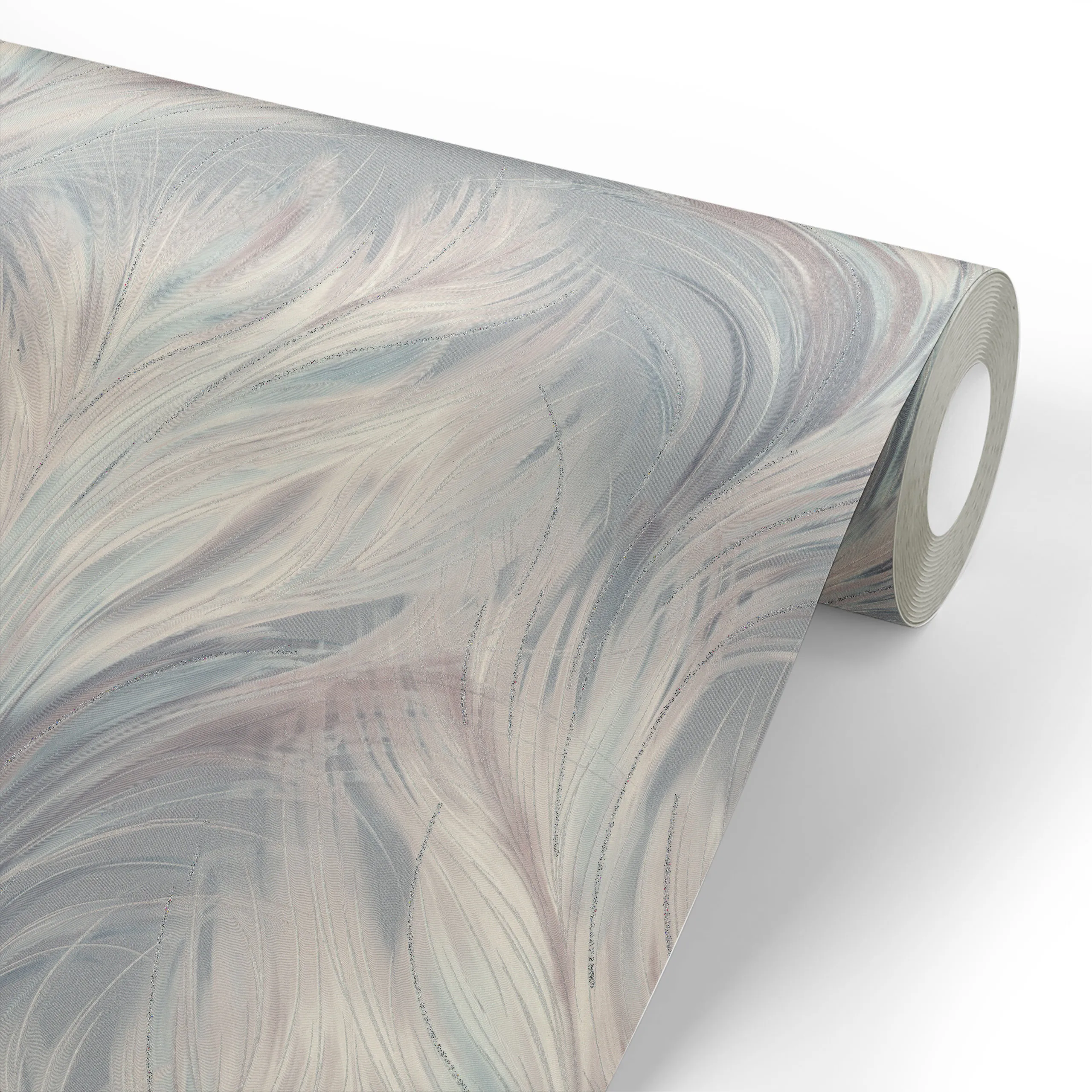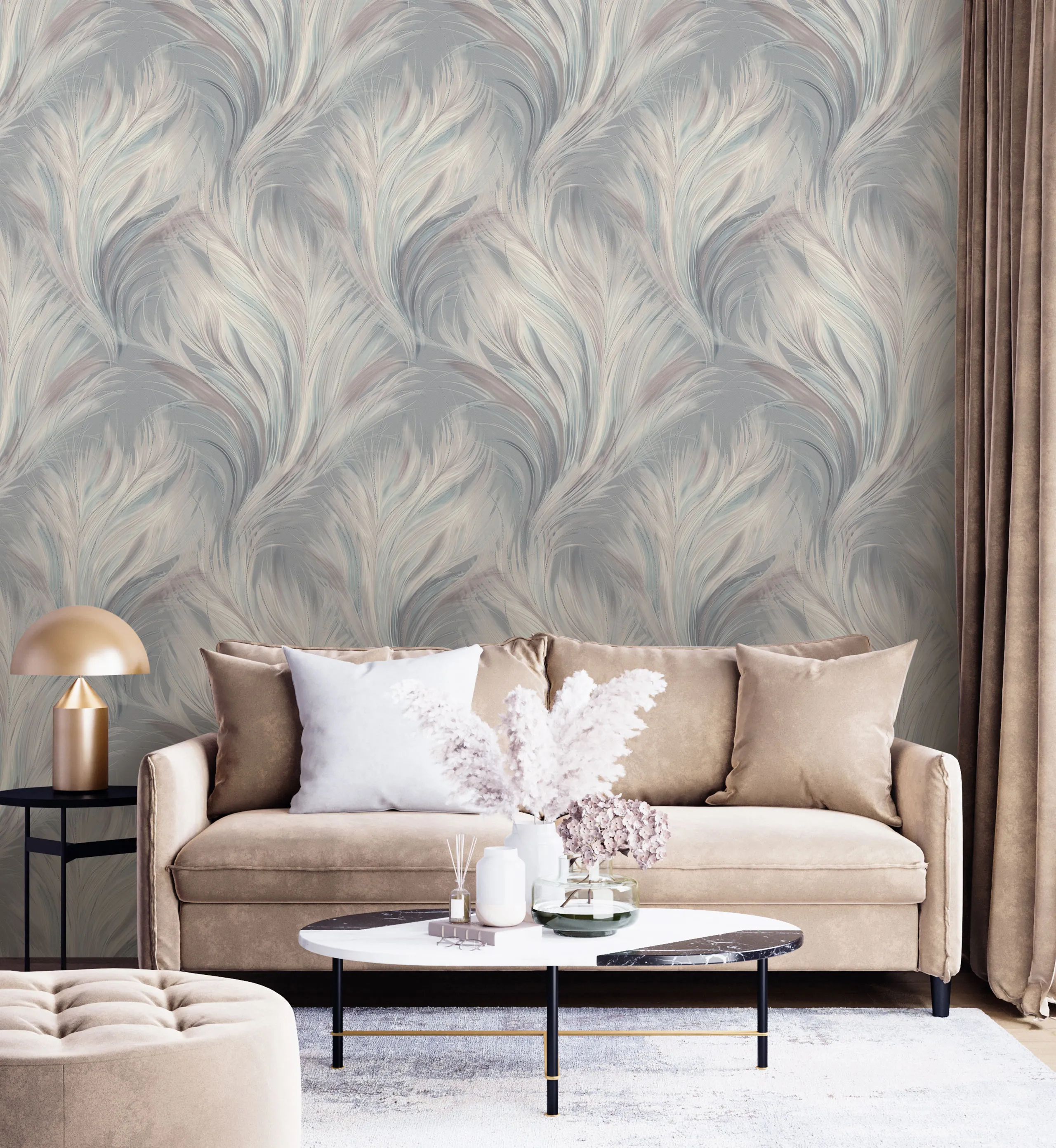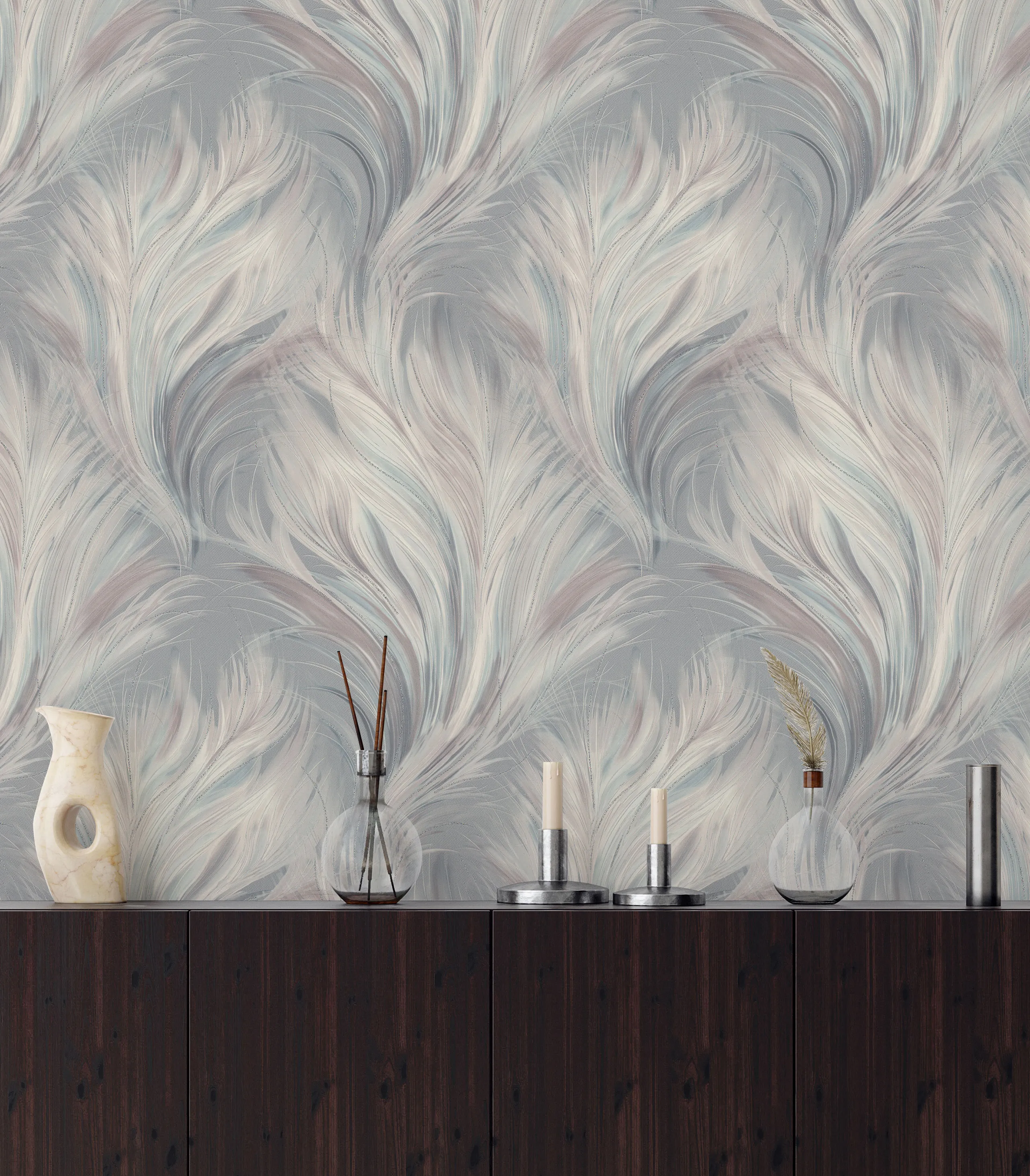 Каждый штрих в композиции передает движение, создавая ощущение, будто перо действительно парит в воздухе. Основа пера прорисована мягким градиентом, а отдельные элементы выделены металликом. Главным цветом коллекции является насыщенный глубокий баклажанный, вдохновленный атмосферой осени. В этой глубокой колористике акценты подчеркнуты необычным глиттером, который переливается разным цветами. Для тех, кто предпочитает более спокойные тона, в коллекции представлены мягкие серые, серо-голубые и бежевые оттенки. Эти цвета более традиционные, но благодаря самому рисунку и спецэффектам обои выглядят празднично и необычно. Фон коллекции напоминает шелковую ткань с выраженной текстурой. Он выполнен в мягких неярких тонах и поддерживает мотив коллекции.