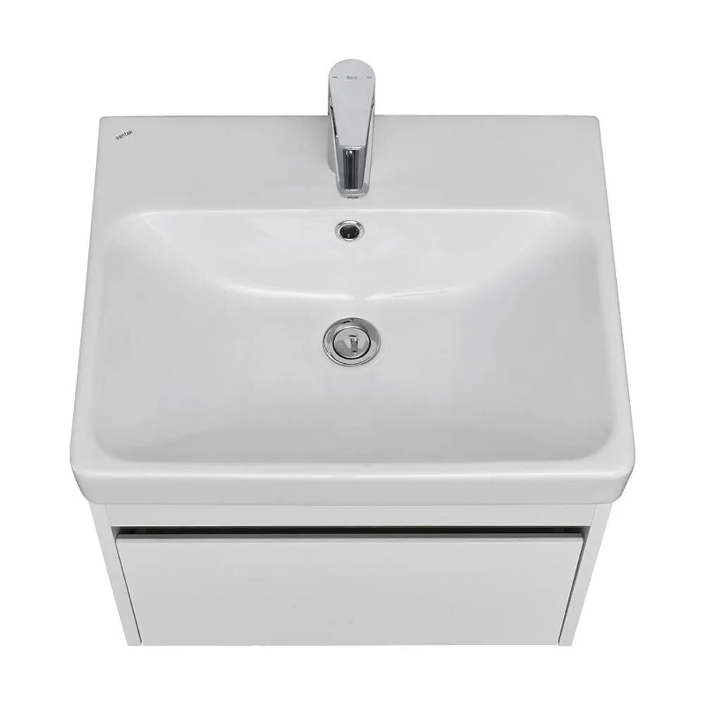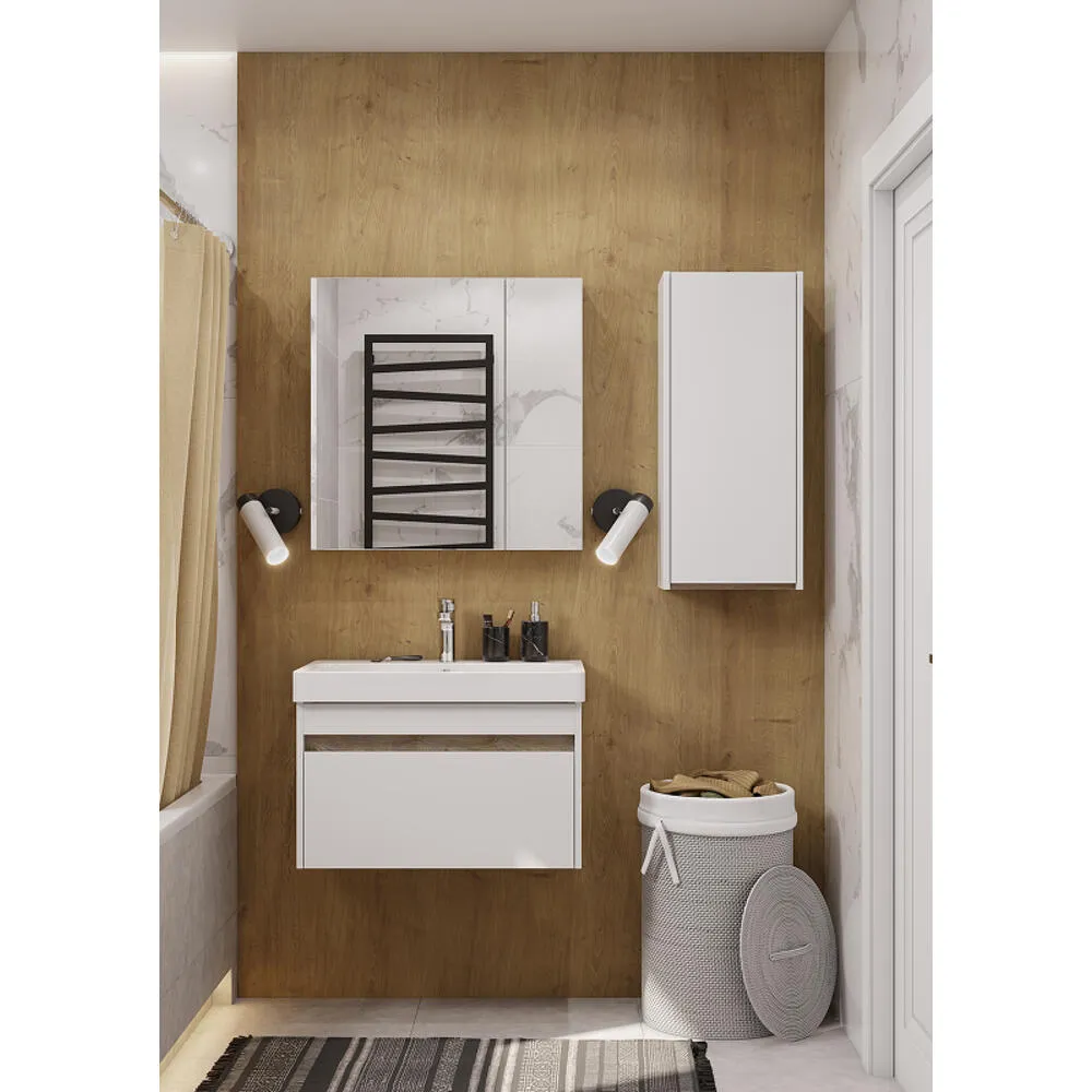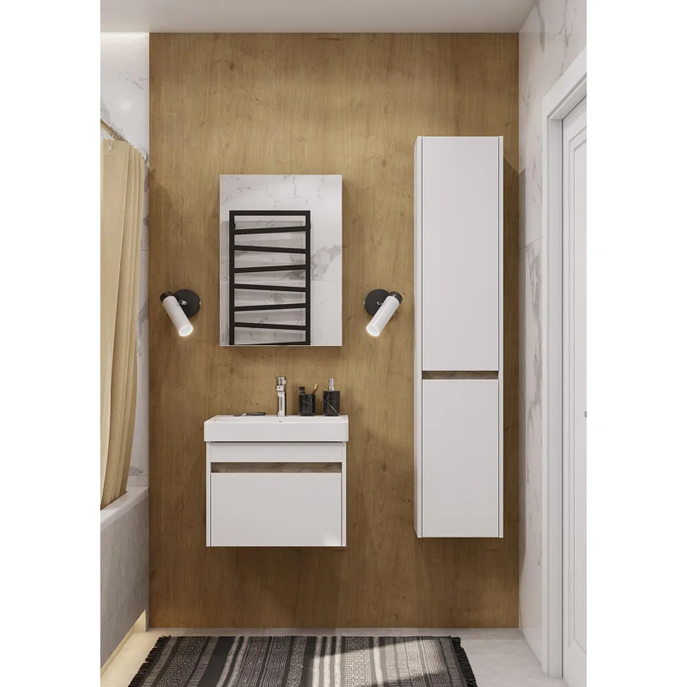 Тумба Марти 55 отличается вместительностью и удобством в использовании: при желании в ящике можно организовать хранение не только шампуней и кремов, но и, например, полотенец. Корпус и боковые стенки изготовлены из влагостойкой ламинированной ДСП, окрашенной в белый цвет специальной краской ультрафиолетового отверждения для защиты мебели от влаги в условиях ванной комнаты. Дополняет комплект прямоугольная раковина Адриана.