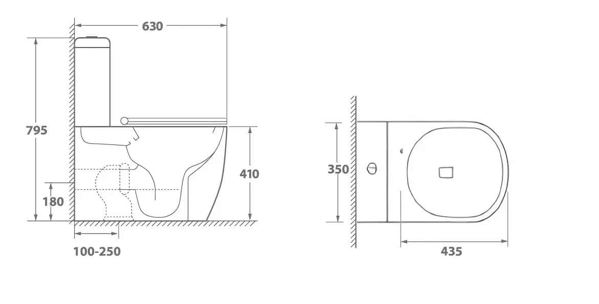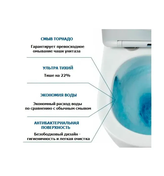 Современный безободковый напольный унитаз строгой формы с инновационным смывом ТОРНАДО. Слив воды мощный, но тихий и при этом экономный расход воды.